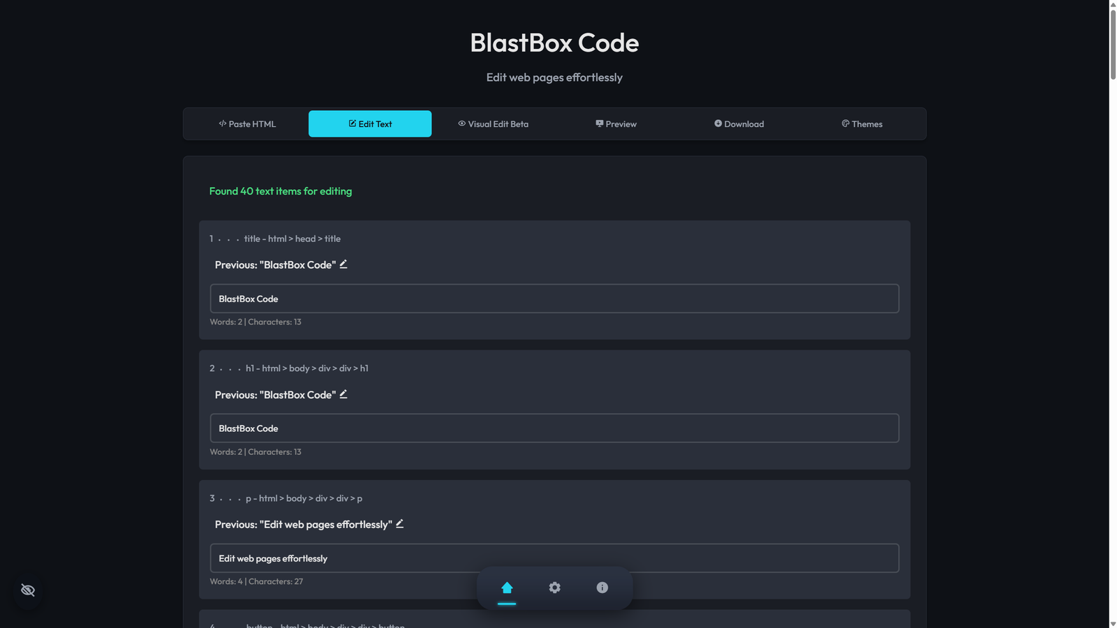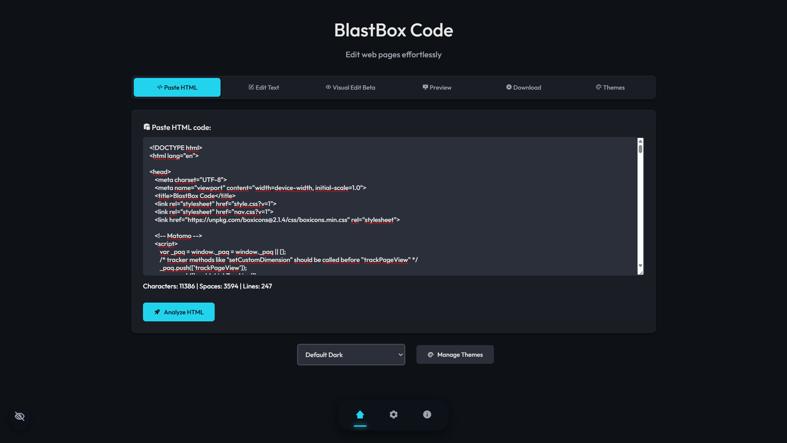 Once you open BlastBox Code, you’ll see a simple editor interface. In the Paste HTML code field, insert the code of the page you want to edit. Then click Analyze HTML and wait for the program to scan and detect all text elements.